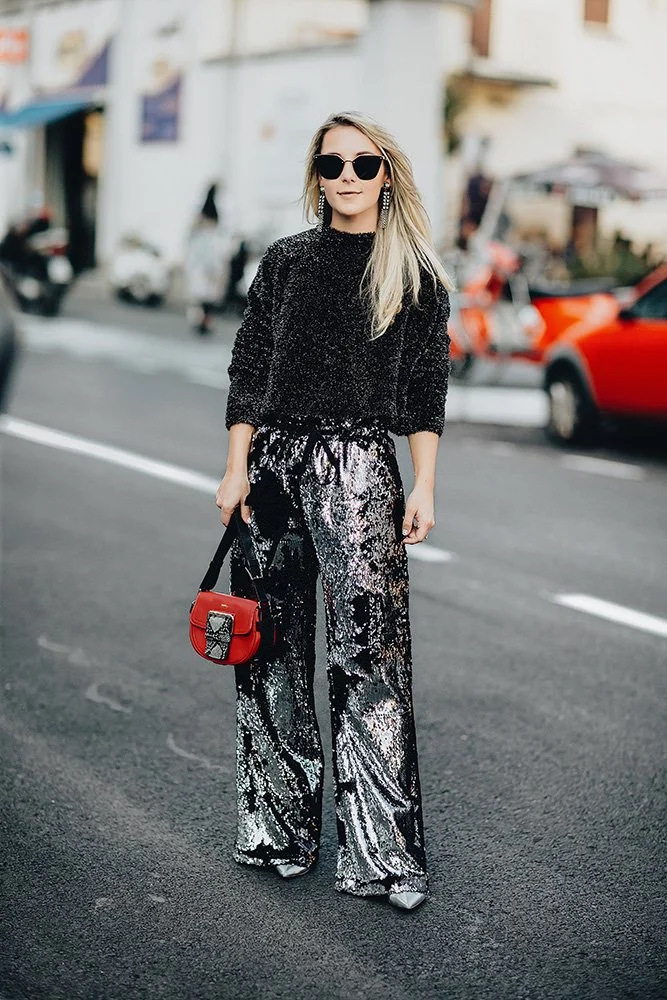Un look con un pantalón de lentejuelas puede convertirse fácilmente en algo exagerado, pero también puede convertirse en algo aburrido. Con esta prenda se trata realmente de encontrar un término medio para que tus pantalones se vean sofisticados.