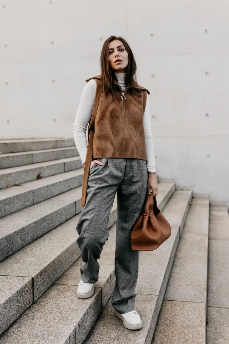 El marrón con gris crean una combinación sutil y elegante. Transmiten serenidad y modernidad, perfectos para looks urbanos y contemporáneos.
