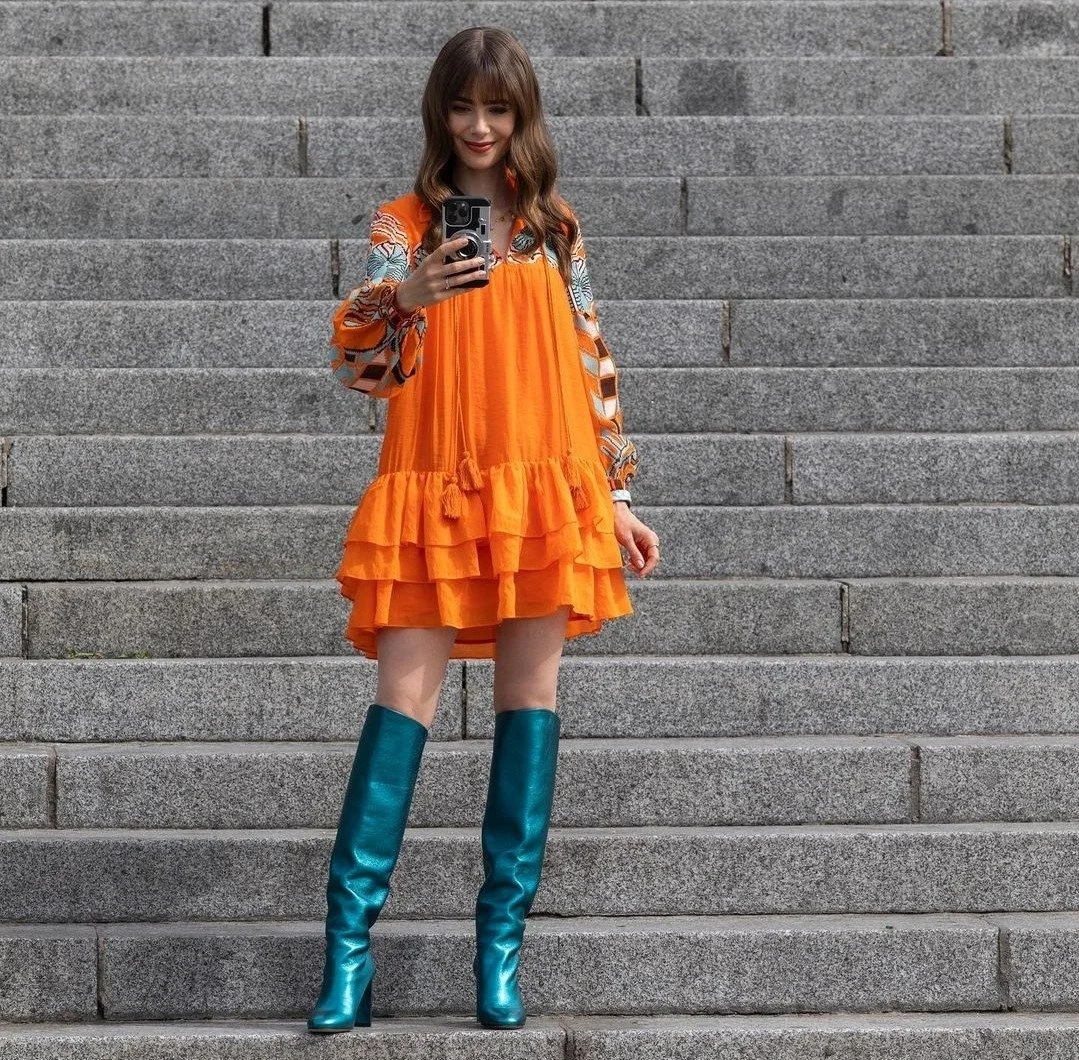 Una de las combinaciones más inesperadas y que más disfruté, de Emily en París fue el look de las botas turquesas de Maison Skorpios y el vestido naranja de H&M.