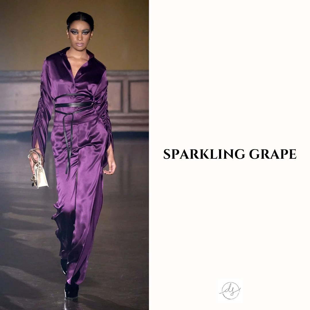El Sparkling Grape es un tono morado vibrante e intenso que ha ganado gran popularidad en la moda de otoño e invierno en los últimos años. Su profundidad y vitalidad lo convierten en una opción perfecta tanto como color principal como acento en una amplia gama de telas, incluyendo seda, terciopelo y algodón. Gracias a su versatilidad, este color se presenta como una elección atractiva para aquellos que buscan añadir un toque elegante y con estilo a su guardarropa.