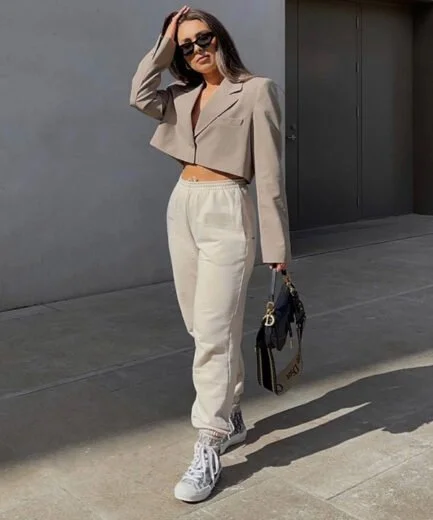 El blazer cropped también te permite hacer combinaciones high-low al llevarlo con prendas mas informales como leggings y zapatos deportivos.
